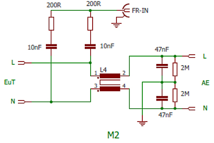 The CDN M2/M3PE 16A is intended to inject common mode disturbance signals to power supply or mains lines (unscreened) in the frequency range from 150 kHz to 230 MHz. The circuitry schematics are shown in fig. 5 and fig.6.